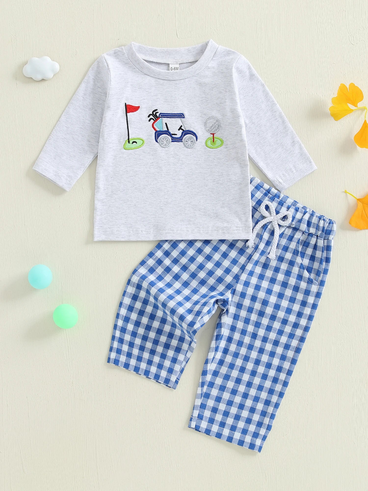Infant Boy Autumn Outfit Embroidered Golf Long Sleeve Sweater with Round Neck and Plaid Pants with Elastic Waistband