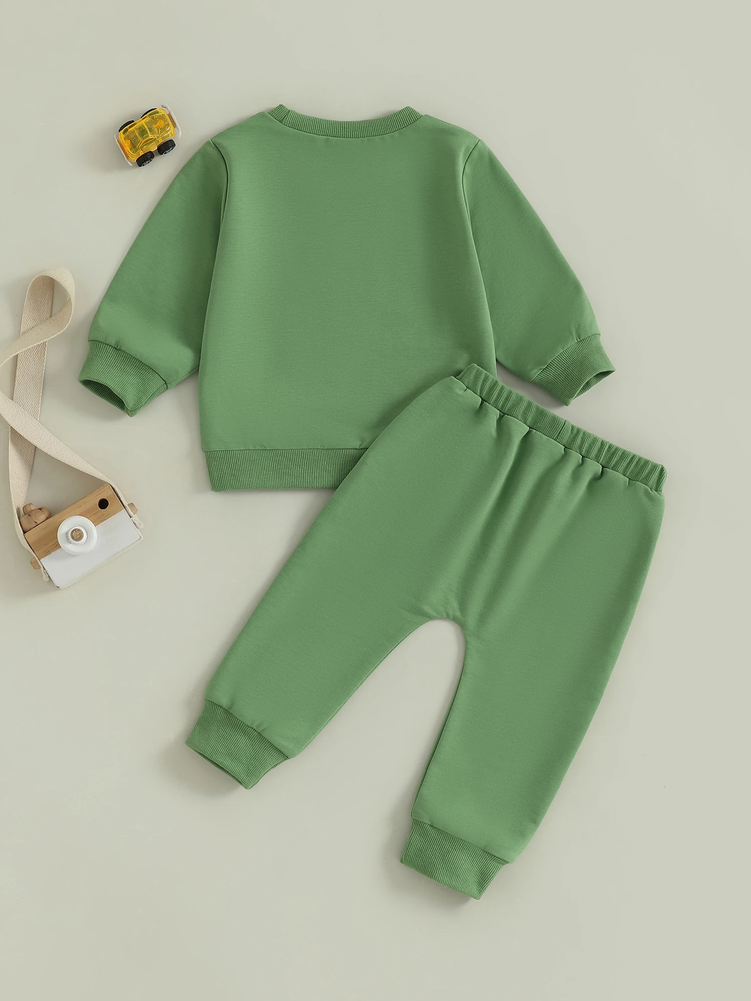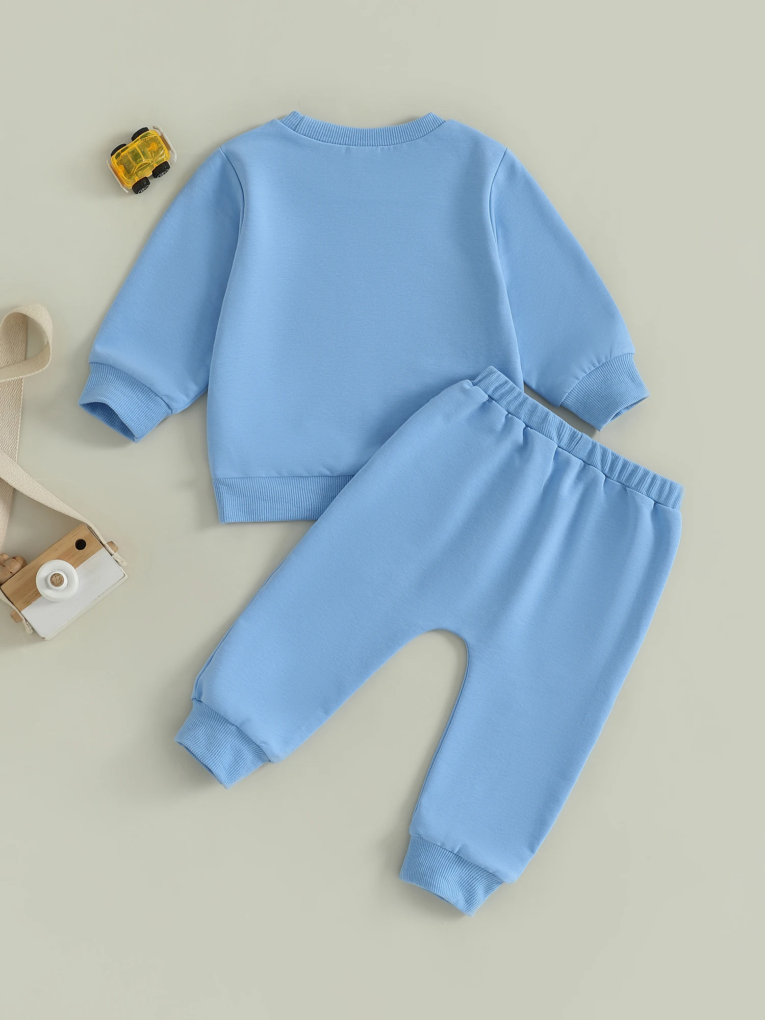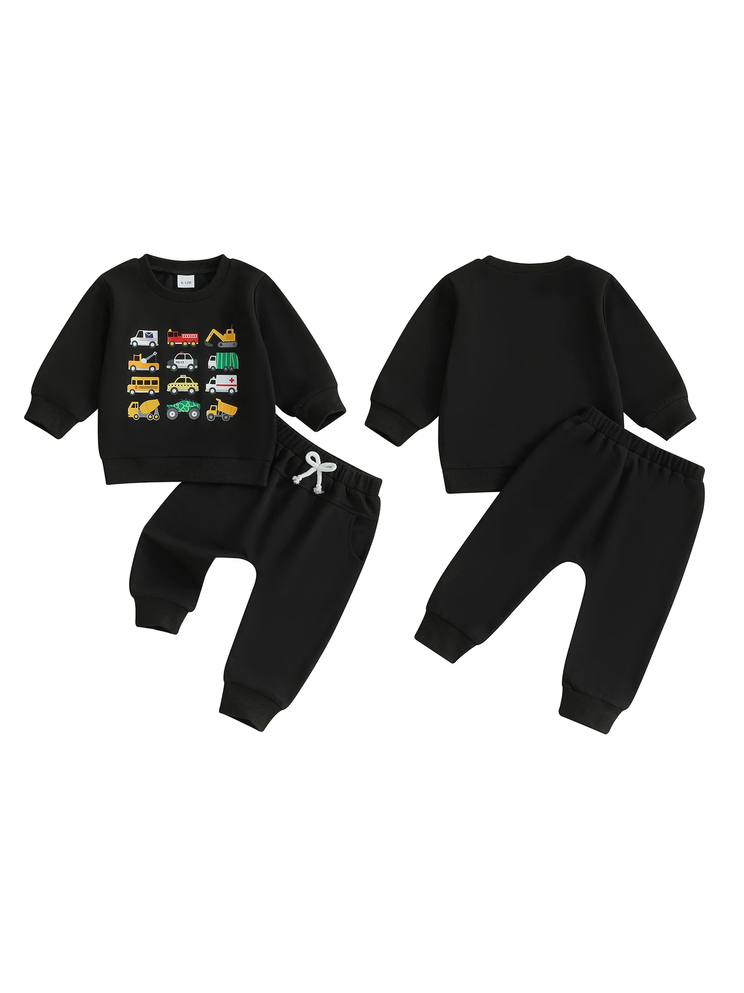 Baby boy fall outfit is warm and cozy; Boy sweatshirt with vehicle print, round neck and long sleeve design; Baby boy pants with elastic waist design to ensure a comfortable fit, perfect for daily wear