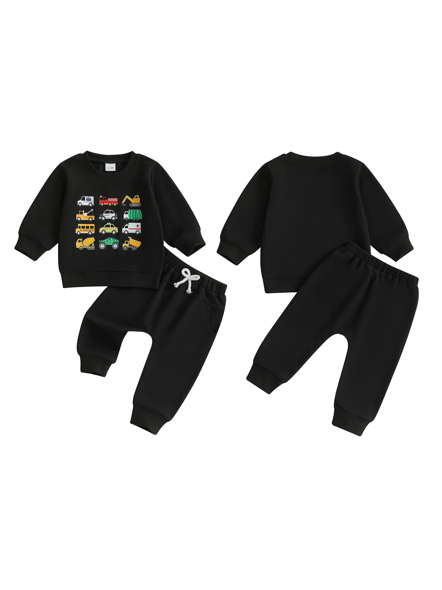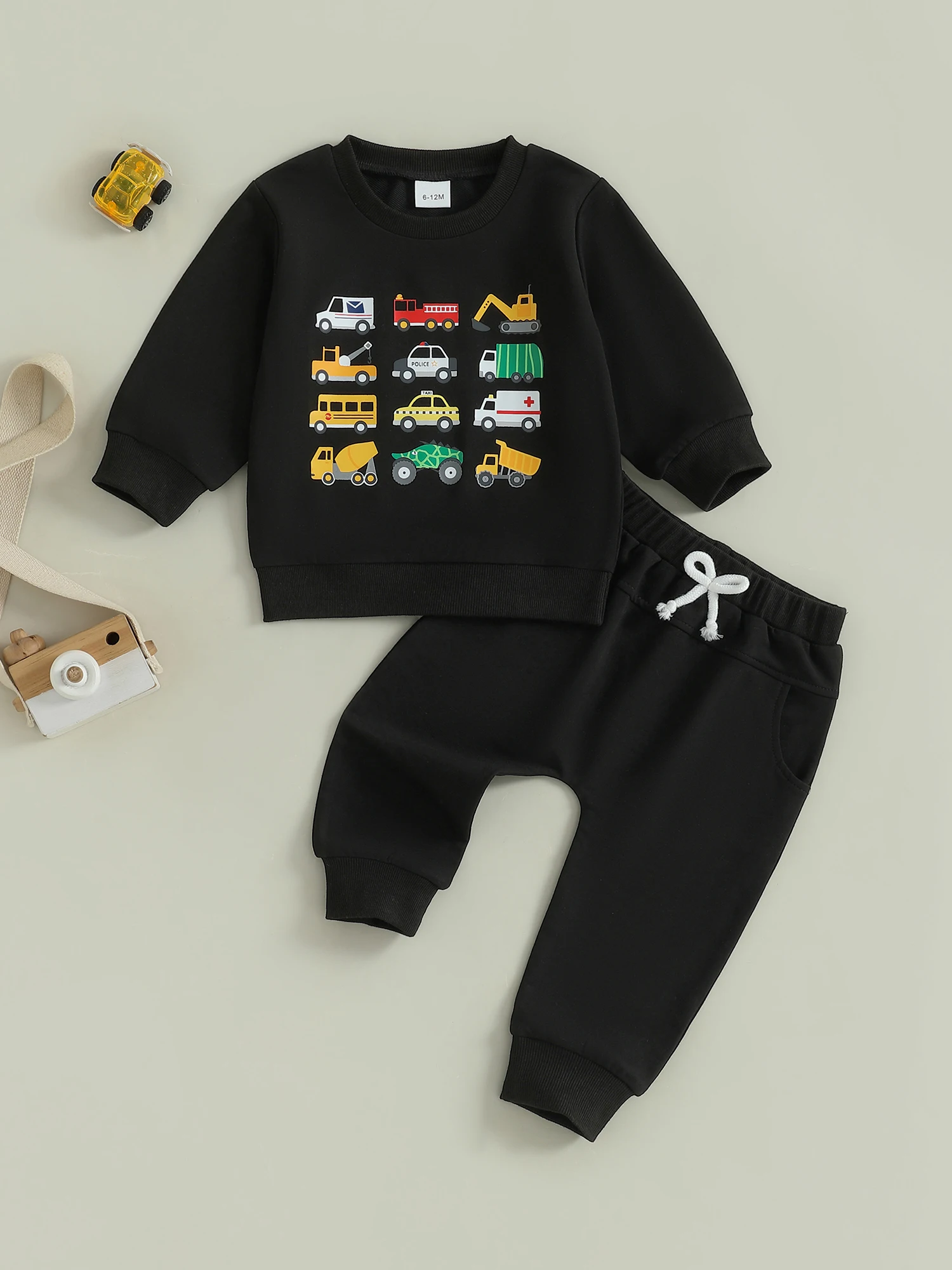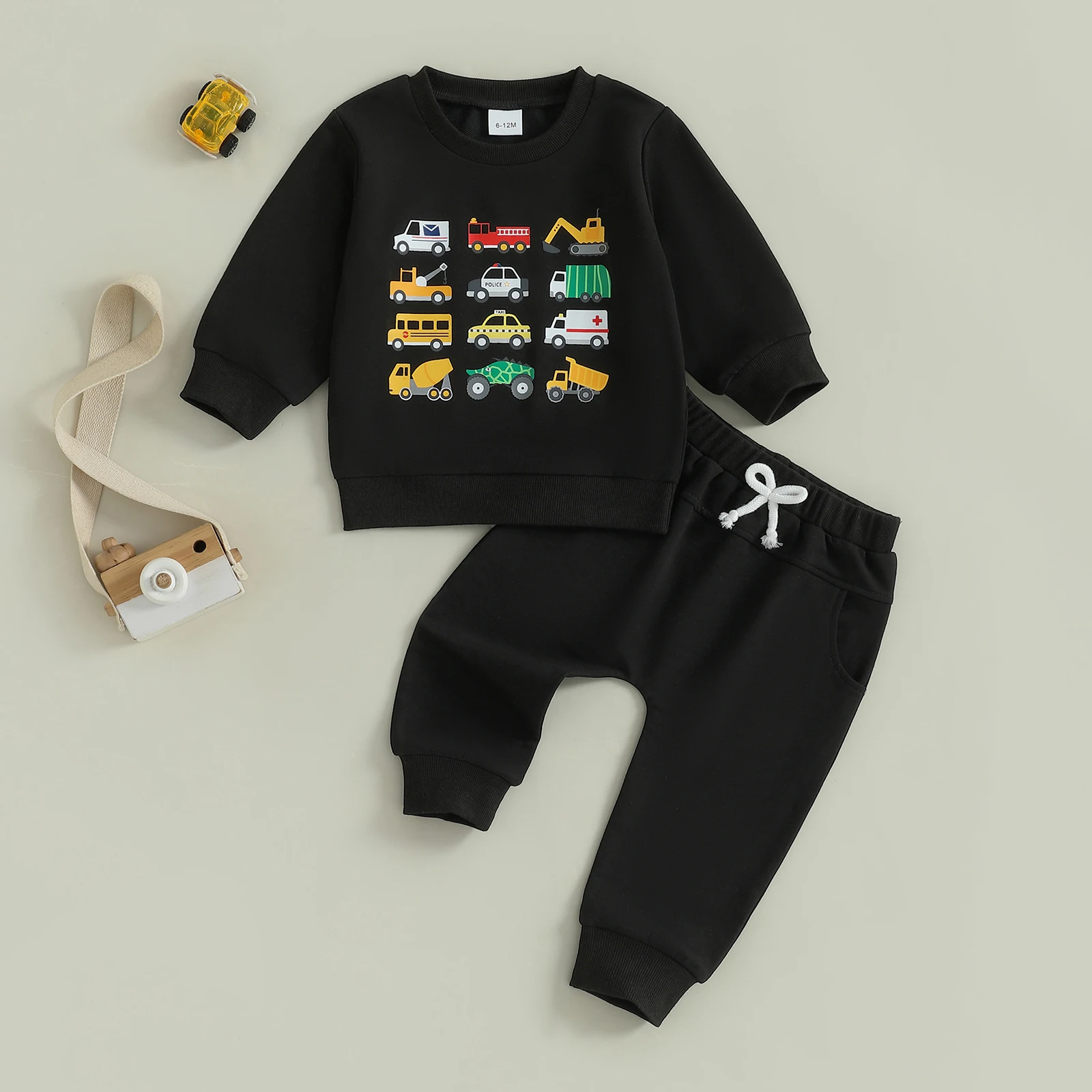 Baby Boy Fall Outfit Vehicle Print Long Sleeve Sweatshirt and Elastic Pants 2 Piece Clothes for Toddler